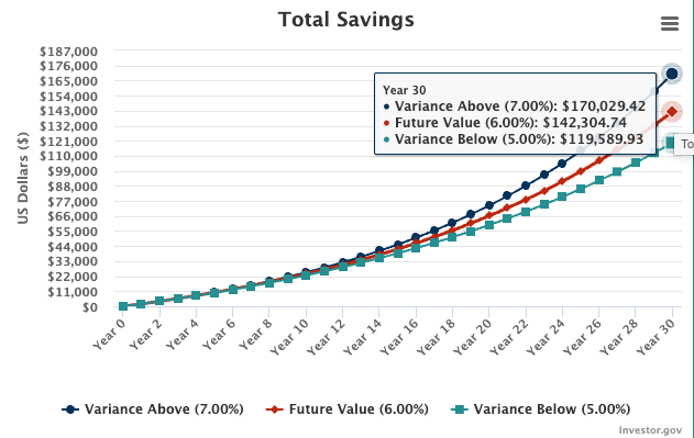 If you can save $1 million by retirement, that would generate $40,000 per year of income. $1 million sounds like a huge number, but you don’t have to save it all at once; most of your retirement nest egg will come from long-term compounding, not just the money you put in from your paychecks. Take a look at how much you’ve saved so far. Use the free compound interest calculator at Investor.gov to see how your savings could grow.